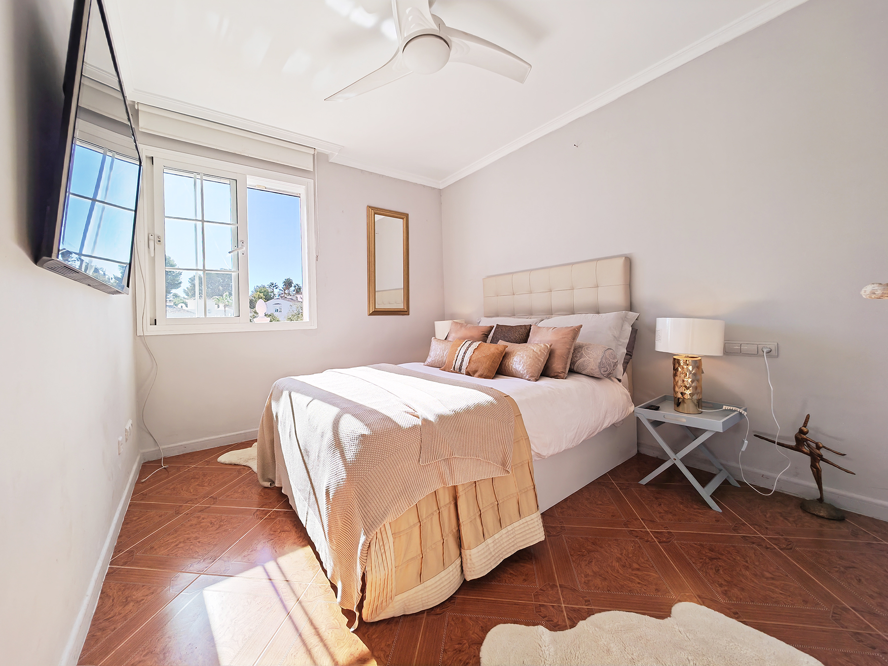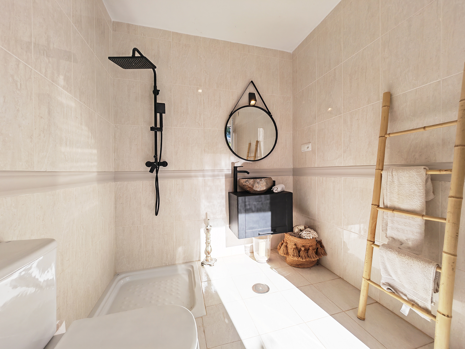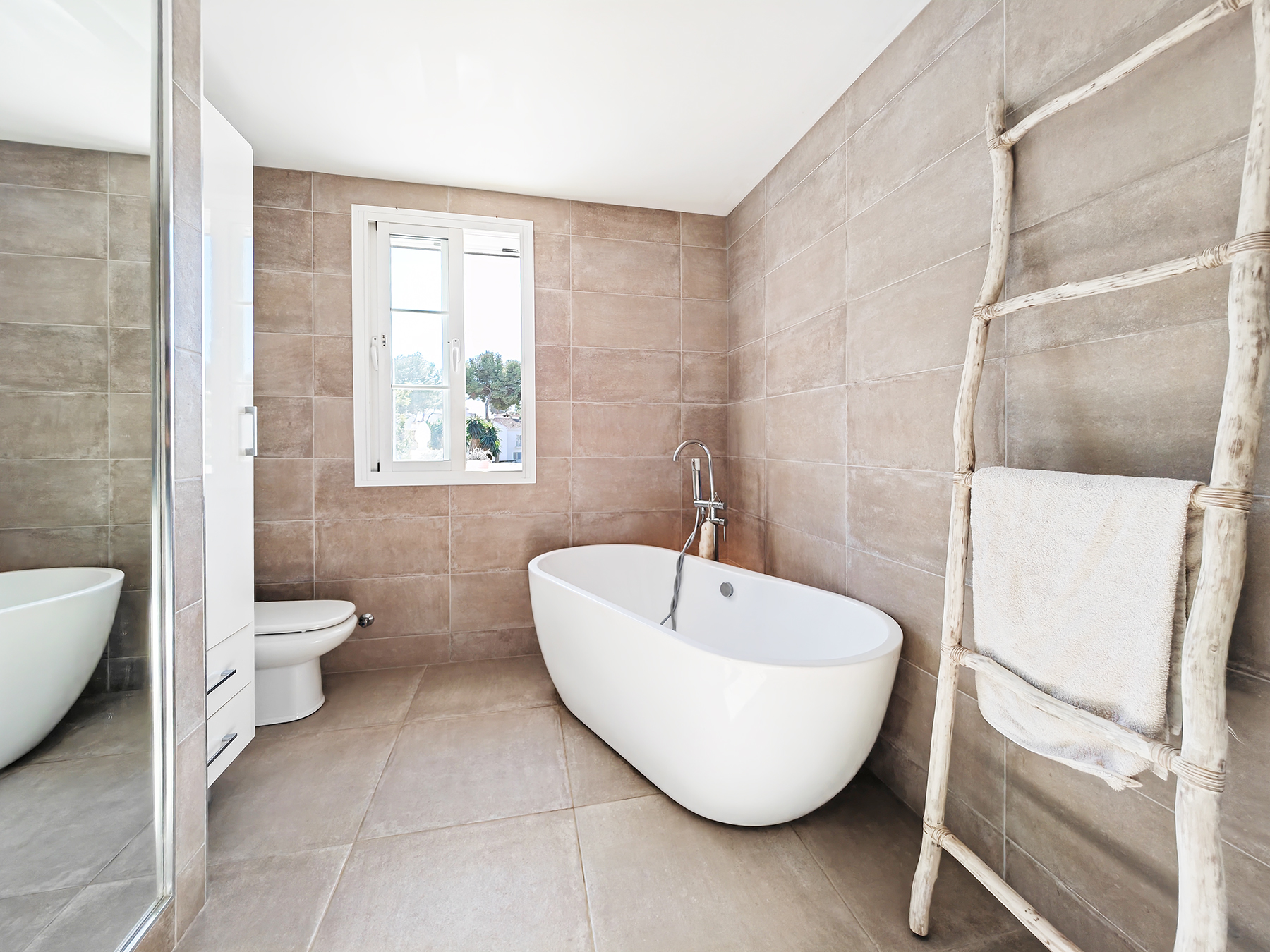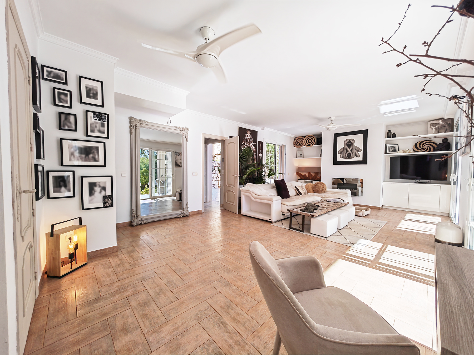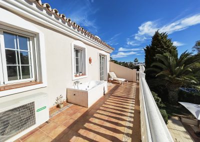 The entrance hall leads to the beautiful lounge that itself leads out onto the large terrace and mature and landscaped gardens with many established tropical trees, palms, fruit trees and roses. The entrance level also has a lovely fully equipped kitchen and a bedroom with views over the garden and a bathroom. On the second floor there are two further bedrooms and a family bathroom and a huge terrace with jacuzzi bath outside with wonderful views of the picturesque garden and more distant tranquil views over the treetops. In addition, the lower floor hosts a fourth bedroom and a bathroom with separate entrance – ideal for teenagers / nanny flat etc.