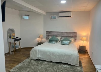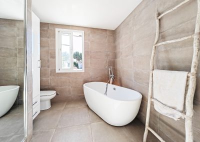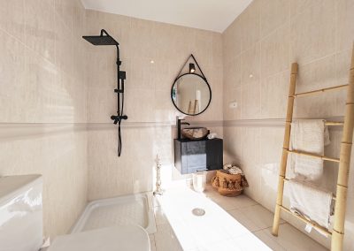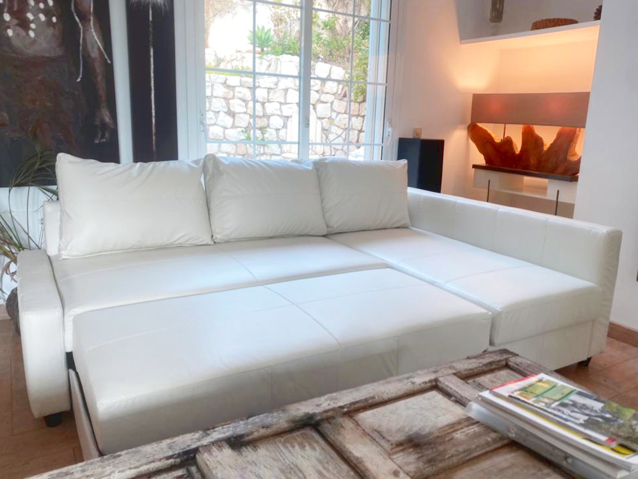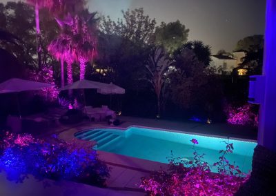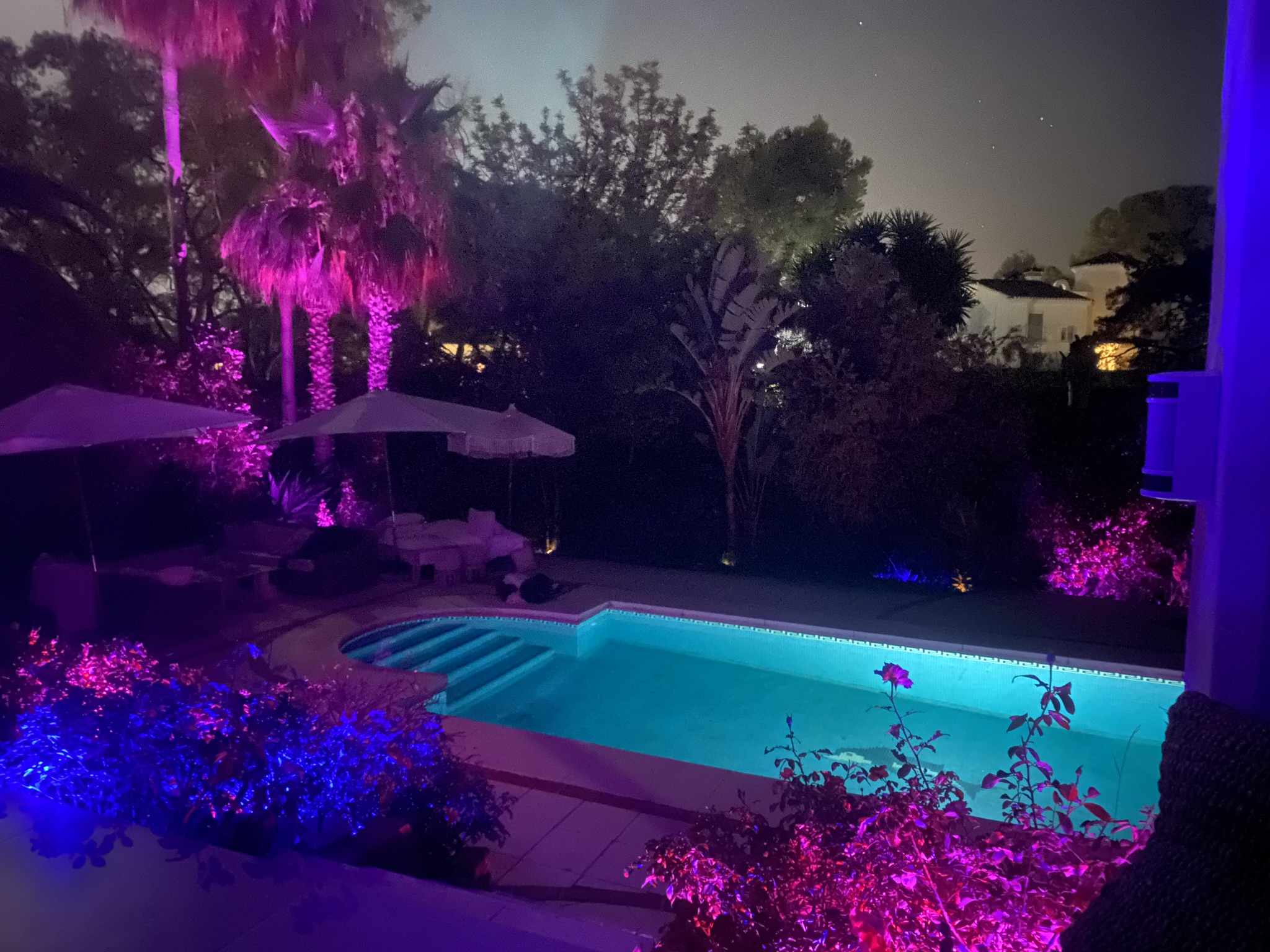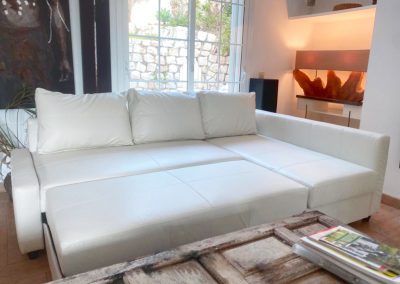 The villa boasts a private heated swimming pool, perfect for refreshing yourself after basking on the sunbeds and chill out sofas. The bright and spacious living room leads out onto the veranda which is shaded – ideal for dining and relaxed evenings watching the sunset. As the evening draws in, the garden is equipped with generous coloured lighting, turning it into a magical and relaxing spectacle.